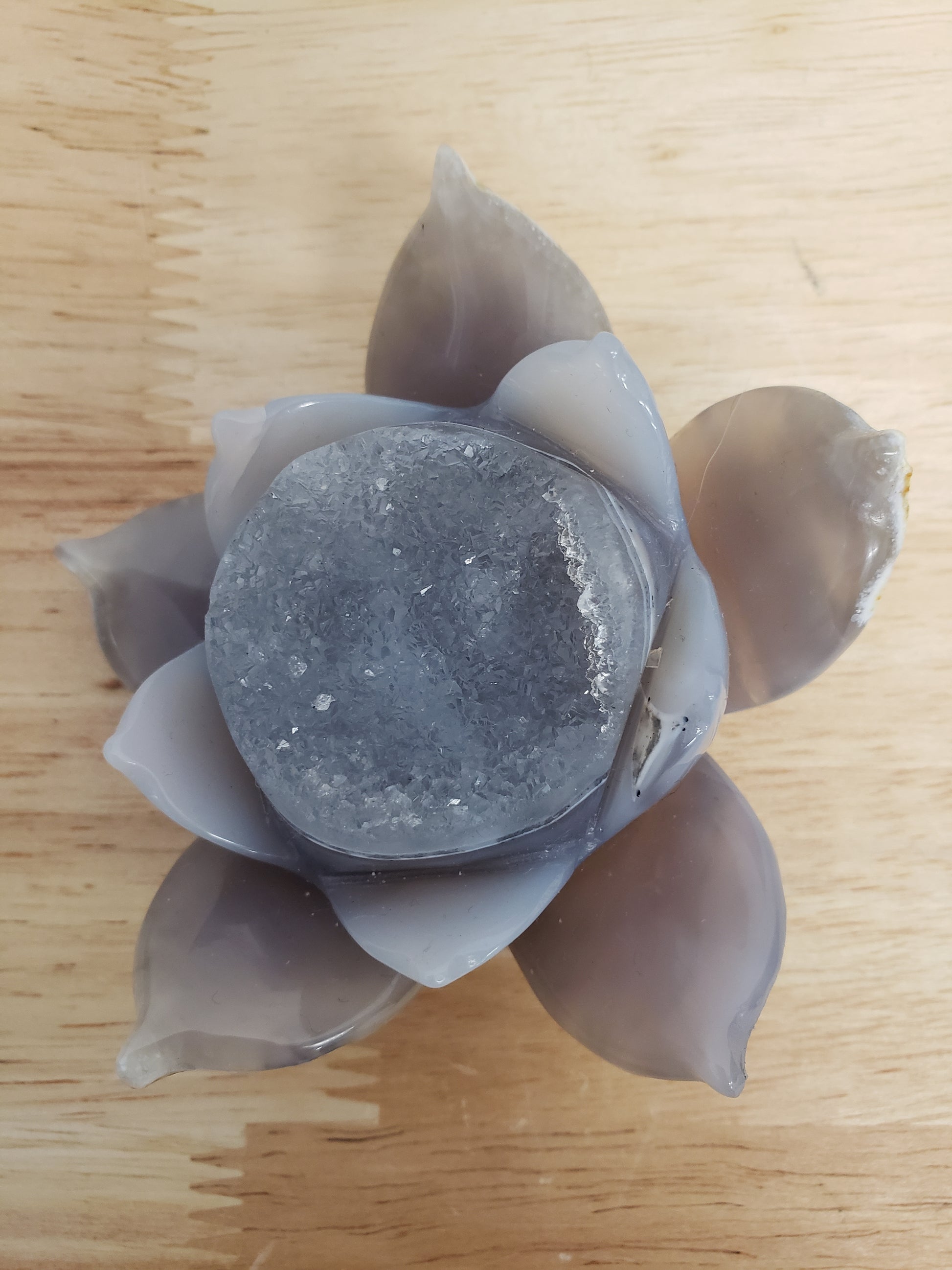 Druzey Agate Flower is a stunning natural formation featuring delicate crystal clusters arranged in a flower-like pattern. This unique piece combines the grounding energy of agate with the uplifting vibrations of druzy crystals. Known for promoting emotional balance and inner peace, druzey agate is believed to enhance clarity and calm the mind. Perfect for meditation spaces, home décor, or crystal collections seeking both natural beauty and spiritual support.